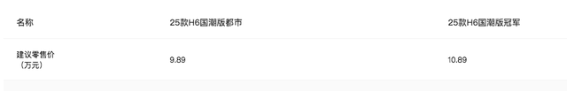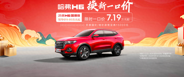 3月1日,笔者从哈弗汽车官方获悉,2025款哈弗H6国潮版现已正式上市,共提供都市版、冠军版等2款车型,官方指导价分别为9.89万元、10.89万元。同时即日起至2025年3月31日,2025款哈弗H6国潮版限时一口价7.19万元起(含现金补贴及厂家置换补贴),另外可享国补/地补政策至高1.5万元。